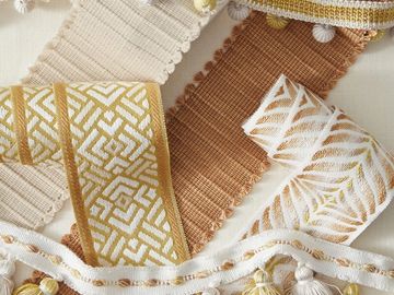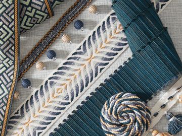 Park Lane Trimmings is exclusive to Carole Fabrics and includes more than 60 trims in six styles and ten colorways. Patterned tapes showcase intricate stitching in mosaic and wave patterns, while solid-colored fringe tapes elegantly add visual interest and texture. The lip cords are gorgeously woven with ornate details. Add movement with tassel fringes, and a twinkle of reflected light with beaded ball fringes.