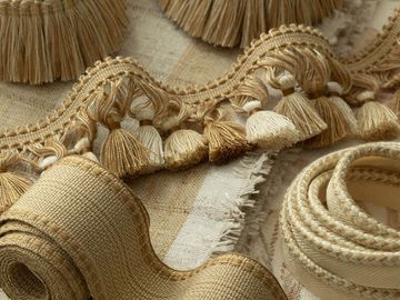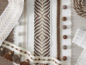Full of bright vivid colors and sophisticated neutrals, Paramount Trimmings includes more than 90 trims in eight styles and nine colorways. This modern collection features detailed design motifs within woven jacquard tapes, lip cords, brush fringes, and tassel fringes.